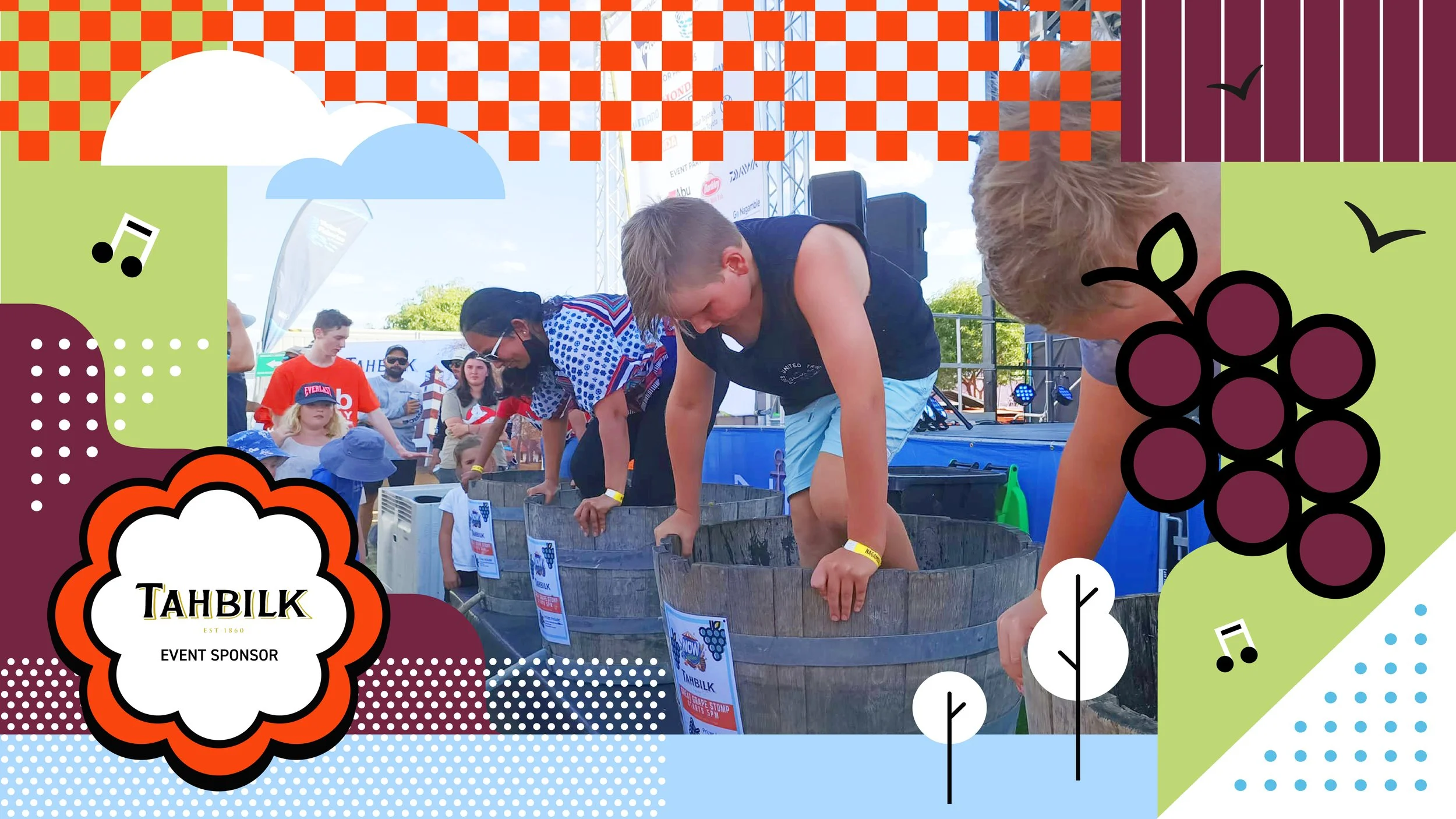 This event is sponsored by Tahbilk Wines, who each year in addition to sponsorship provide all the grapes and barrels for stomping.